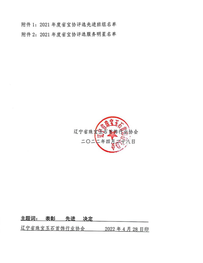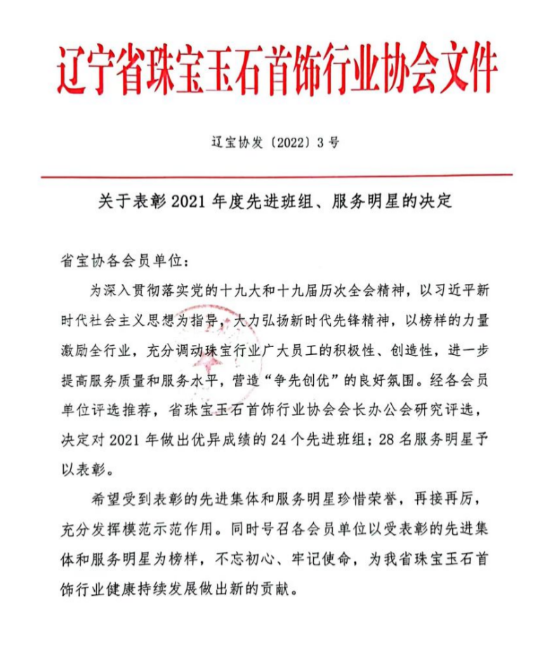 近日,辽宁省珠宝玉石首饰行业协会发布了“关于表彰2021年度先进班组、服务明星的决定”,我院资源系宝石教研室被评为“2021年度辽宁省珠宝玉石首饰行业协会先进班组”,宝石专业教师范泽、戚鸣两位同志被评为“2021年度辽宁省珠宝玉石首饰行业协会服务明星”。
